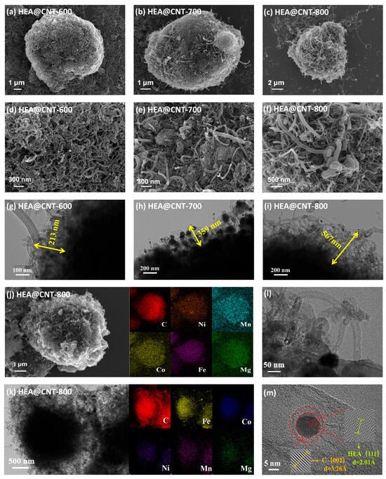 (a–f) SEM images of HEA@CNT-600/700/800, (g–i) TEM images of HEA@CNT-600/700/800, (j,k) EDS elemental mapping of HEA@CNT-800, (l,m) HR-TEM images of selected areas.