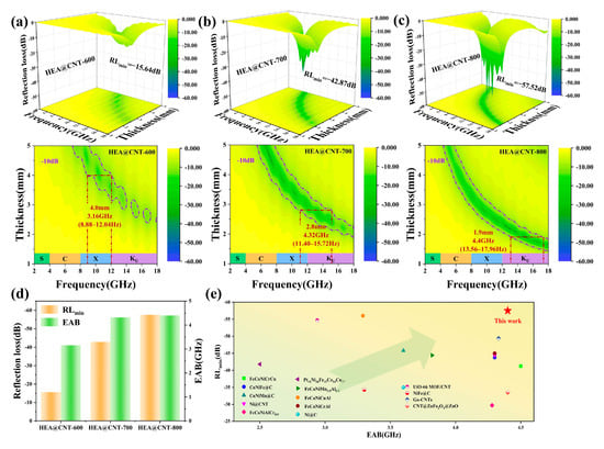 Reflection loss (RL) and corresponding 2D maps of samples (a) HEA@CNT-600, (b) HEA@CNT-700 and (c) HEA@CNT-800, (d) The RLmin and EABmax values of HEA@C-600/700/800, (e) RLmin and EABmax of the present work and other wave-absorbing materials.