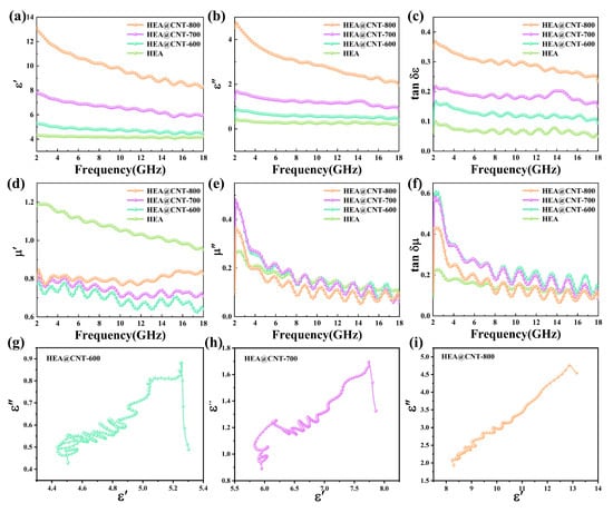 (a) ε′, (b) ε″, (c) tan δε, (d) μ′, (e) μ″, (f) tan δμ, Cole–Cole plot of (g) HEA@CNT-600, (h) HEA@CNT-700 and (i) HEA@CNT-800.