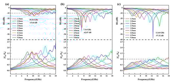 As essential components for electromagnetic protection, stealth technology, and electronic device compatibility, electromagnetic wave (EMW) absorption materials perform a key role. Their mechanism of action lies in the efficient transformation of incident electromagnetic wave energy into dissipative thermal or other energy forms [1,2,3]. Ideal EMW absorption materials must satisfy two core requirements: (1) favorable impedance matching ensures sufficient penetration of electromagnetic waves into the material interior, which is a prerequisite for subsequent energy dissipation; (2) the material possesses pronounced loss capability, characterized by the efficient transformation of incident electromagnetic energy into heat or other energy forms for dissipation [4]. To date, researchers have developed various electromagnetic wave absorbing materials, such as ferrites [5,6,7] and carbon nanotubes [8,9,10,11], both of which can exhibit strong EMW absorption. However, the EMW absorption of ferrites relies solely on the magnetic loss mechanism, and that of carbon nanotubes depends only on the dielectric loss mechanism. If a material is primarily dominated by a single loss mechanism, it is often difficult to achieve a balance between the strong absorption (RLmin) and broad bandwidth (EAB) at relatively thin matching thicknesses.