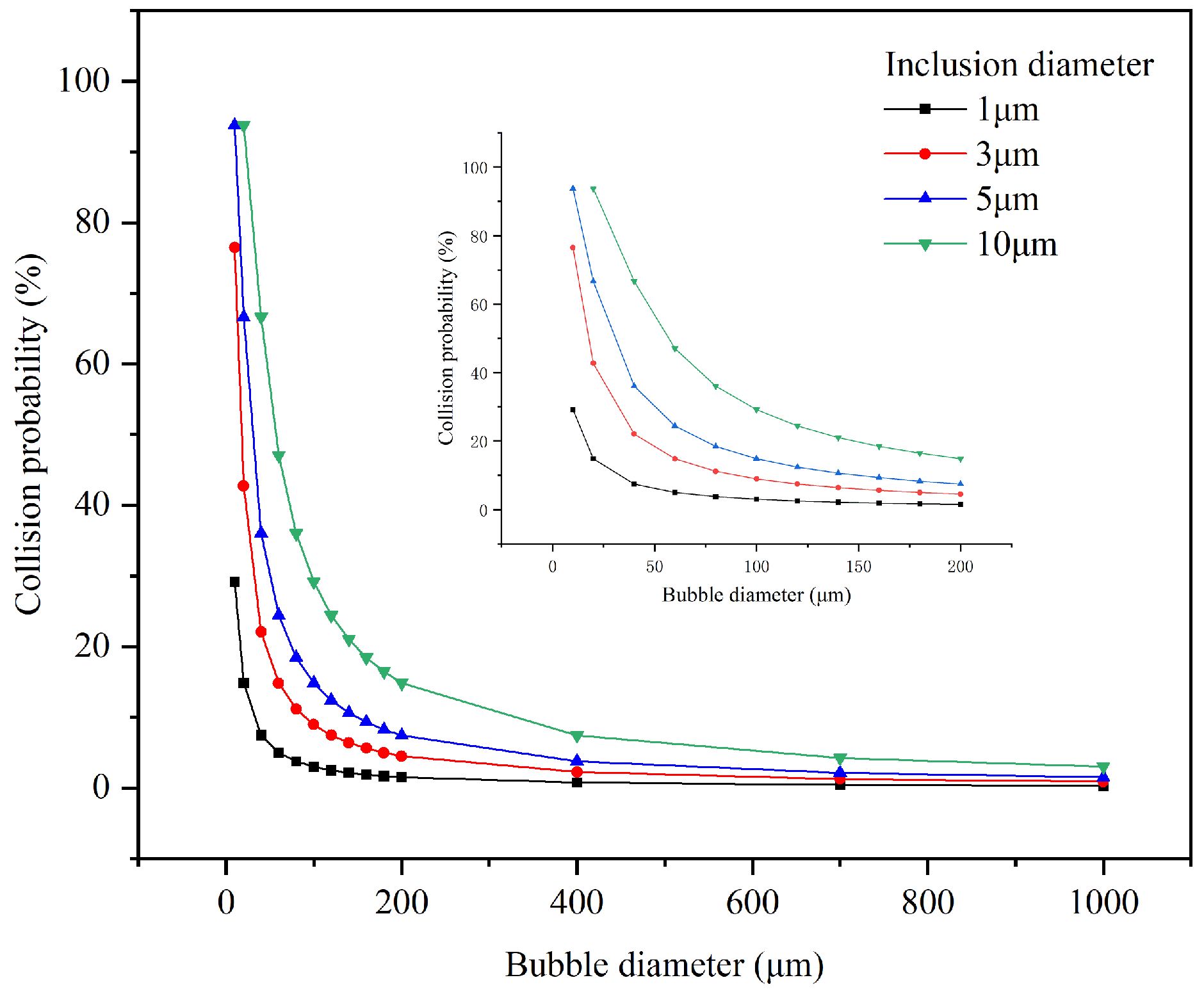 The observed bubble sizes in this experiment primarily range from 10 to 1000 μm. Consequently, the collision probability between bubbles and inclusions smaller than 10 μm is analyzed within this size range. The results are shown in