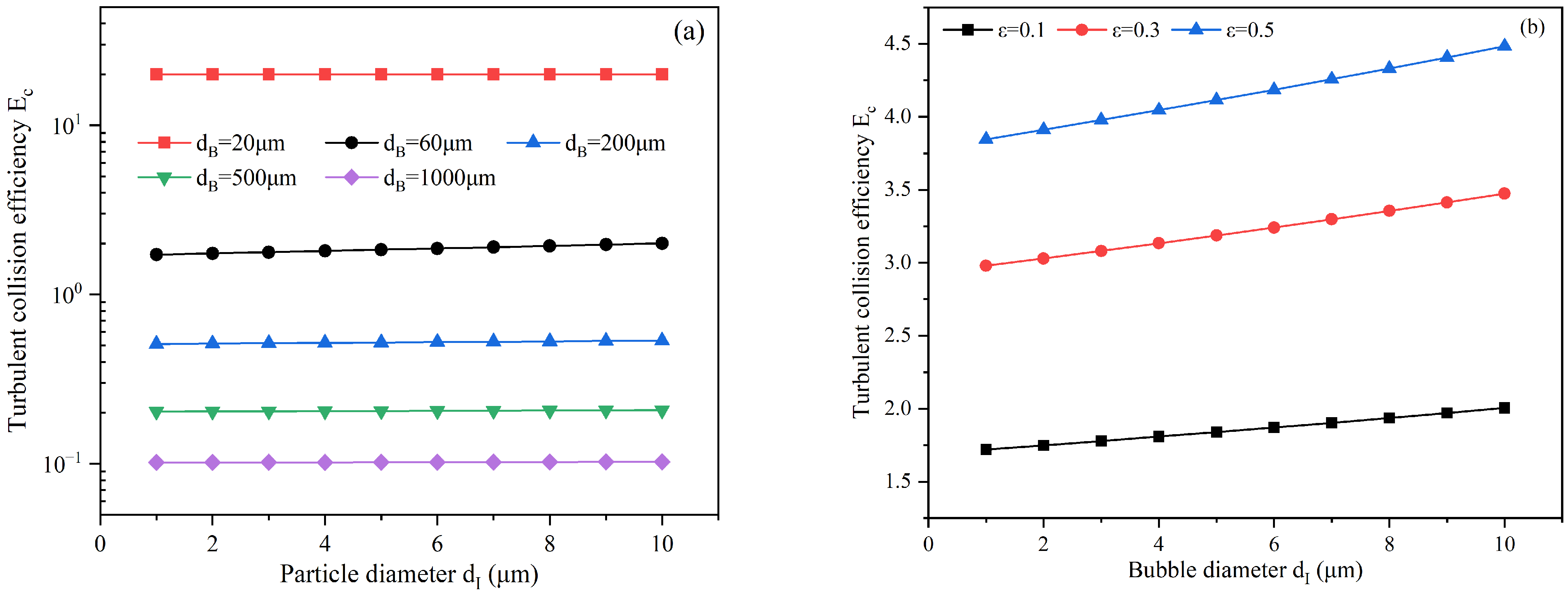 Figure 8b, the collision efficiency increases significantly with the increase in the turbulent kinetic energy dissipation rate. It should be noted that turbulence can significantly enhance the relative motion between bubbles and inclusions, making their relative velocity much greater than that under the influence of gravity, which results in a collision efficiency greater than 1. In general, the turbulent environment will further increase the collision probability of bubbles and small inclusions, thereby enhancing the inclusion removal ability of bubbles.