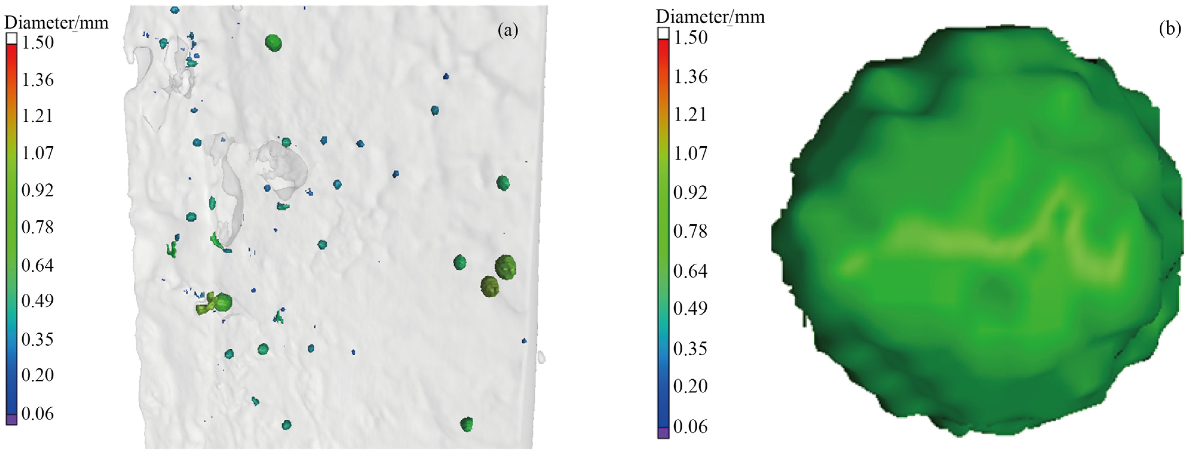 The CT scanning revealed a large number of bubbles within the sample, with sizes ranging from 0.06 to 1.43 mm. Due to the 100 mm length of the sample, the bubbles in the three-dimensional map appear too small. Therefore, a local region is magnified, as shown in
