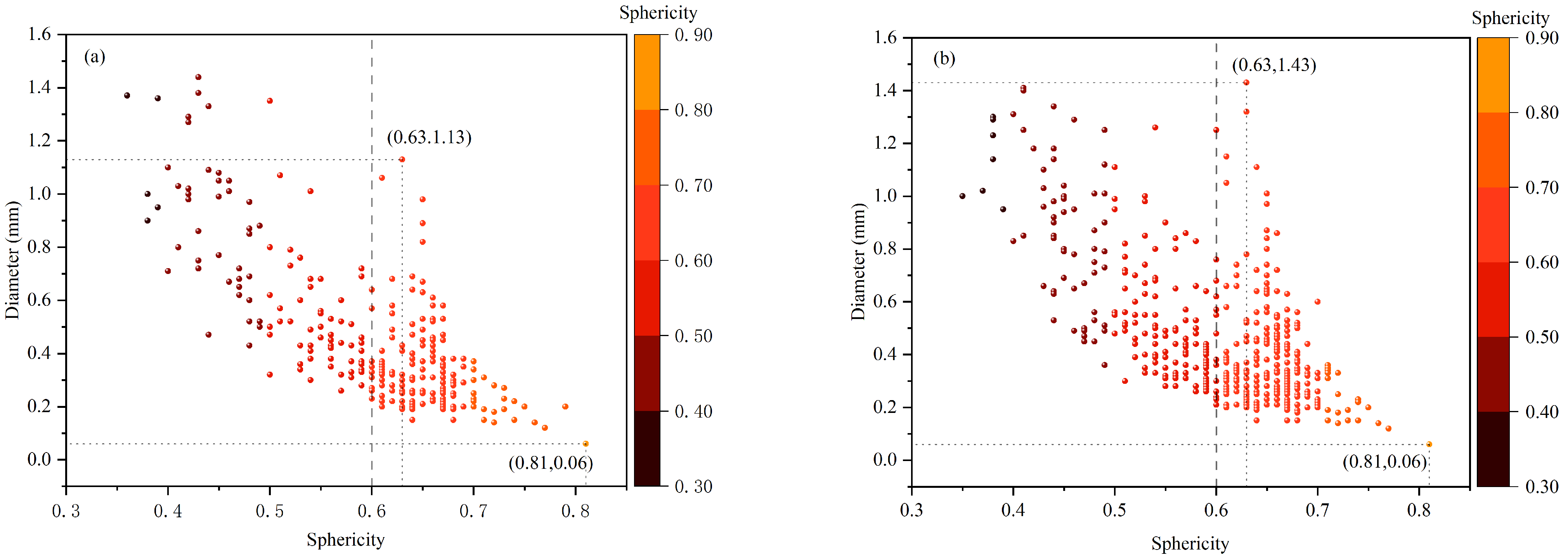 The relationship between pore sphericity and diameter in the upper and lower samples is analyzed. Since the bubble of diameter < 3 mm is spherical [