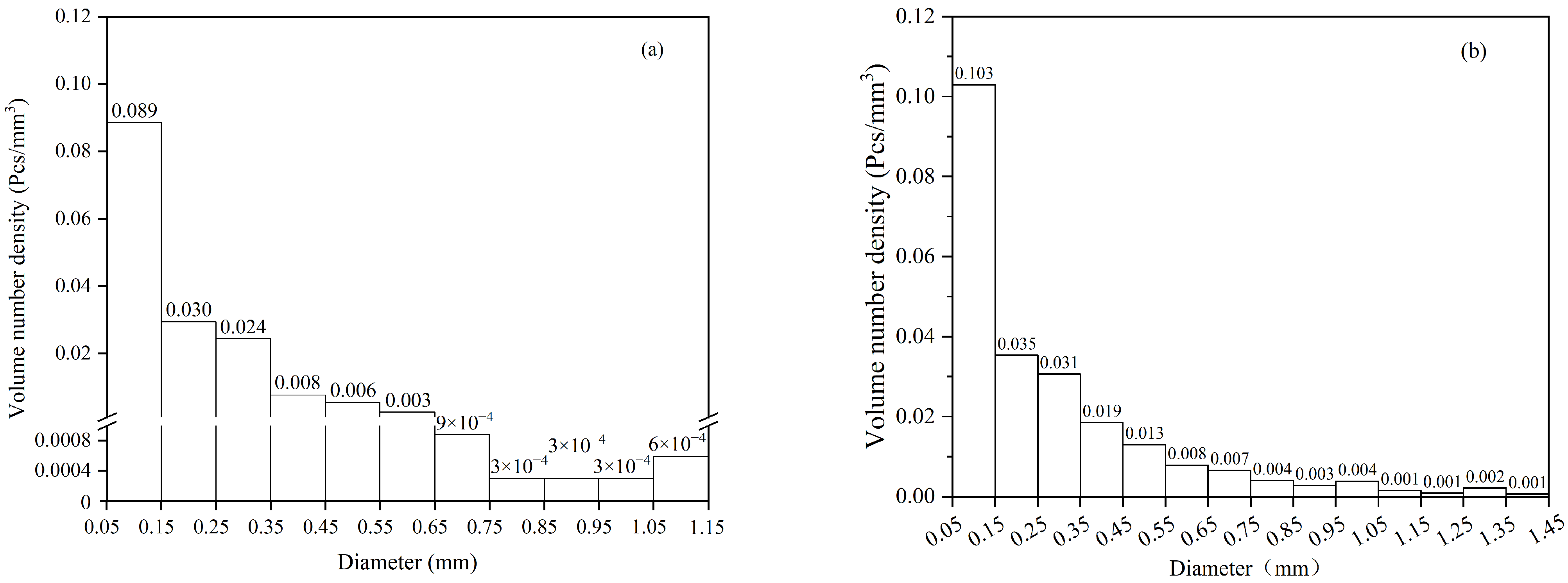 34]. However, the number of bubbles larger than 0.06 mm detected in this experiment increases as the diameter decreases, indicating the presence of a substantial number of bubbles smaller than 0.06 mm. Subsequent electron microscope observations of the samples support this inference.