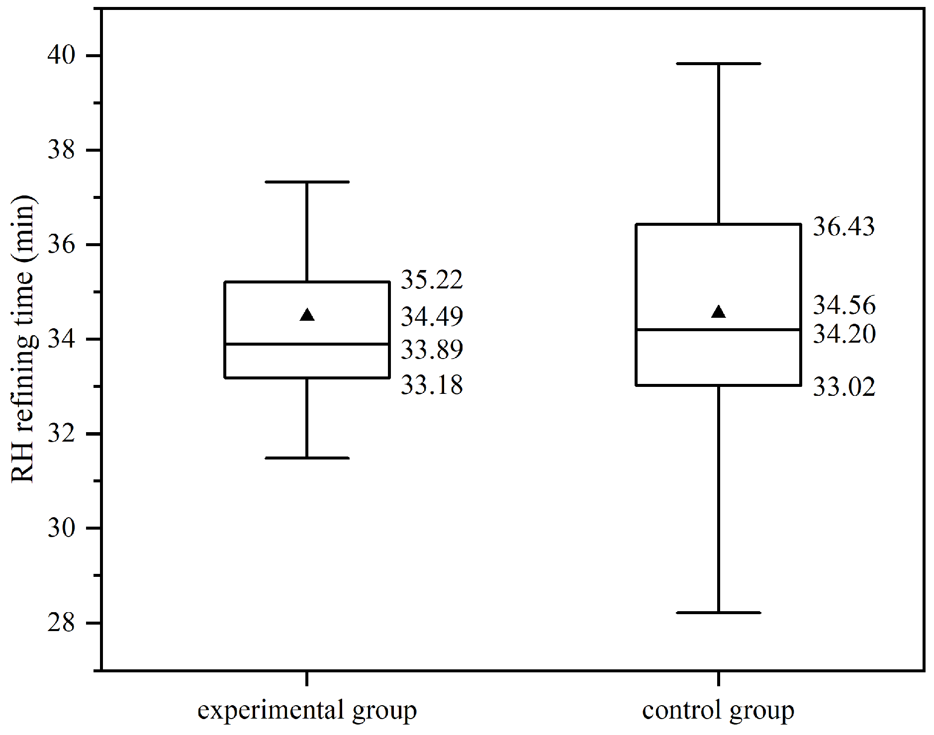 Figure 14) are similar, at 34.49 min for the experimental group and 34.56 min for the control group. The median values are also comparable, at 33.89 min for the experimental group and 34.20 min for the control group.