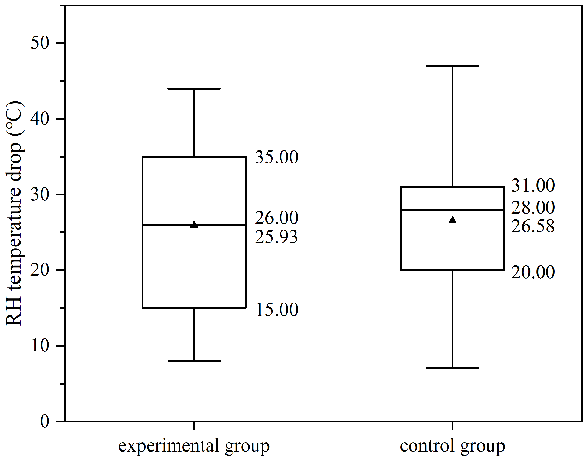 Figure 15, the distribution of RH temperature drops for both the experimental and control groups is similar. The outlet temperature drop for the experimental group primarily ranges from 15.00 to 35.00 °C, whereas that for the control group mainly falls within 20.00 to 31.00 °C. Their average temperature drops are approximately the same, at 25.93 °C and 26.58 °C, respectively. Similarly, the median values are close, at 26.00 °C and 28.00 °C, respectively. Overall, the distribution range, mean, and median of the temperature drops in the experimental group are consistent with those in the control group, with differences of approximately 1–2 °C.