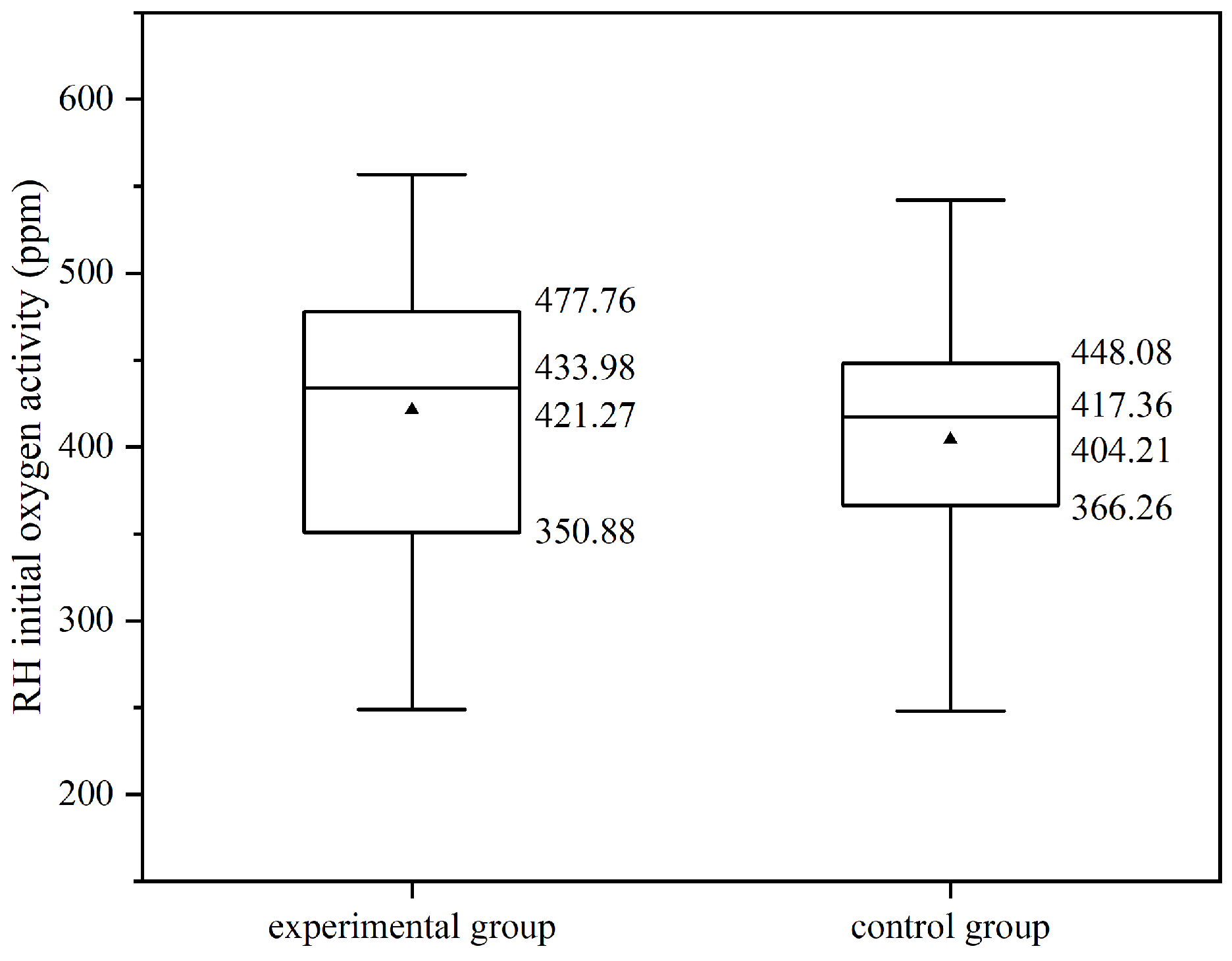 The standard error of the initial oxygen activity in the experimental group is 21.09 ppm, which is less than 0.1 of the mean value, and the 95% confidence interval of the mean value is (376.77 ppm, 465.77 ppm). The standard error of the initial oxygen activity in the control group is 15.18 ppm, which is less than 0.1 of the mean value, and the 95% confidence interval of the mean value is (373.51 ppm, 434.91 ppm). The mean absolute deviations of the experimental group and the control group are 72.00 ppm and 66.15 ppm, respectively, with the experimental group being 109% of the control group, indicating a small difference in the degree of dispersion between the two groups.