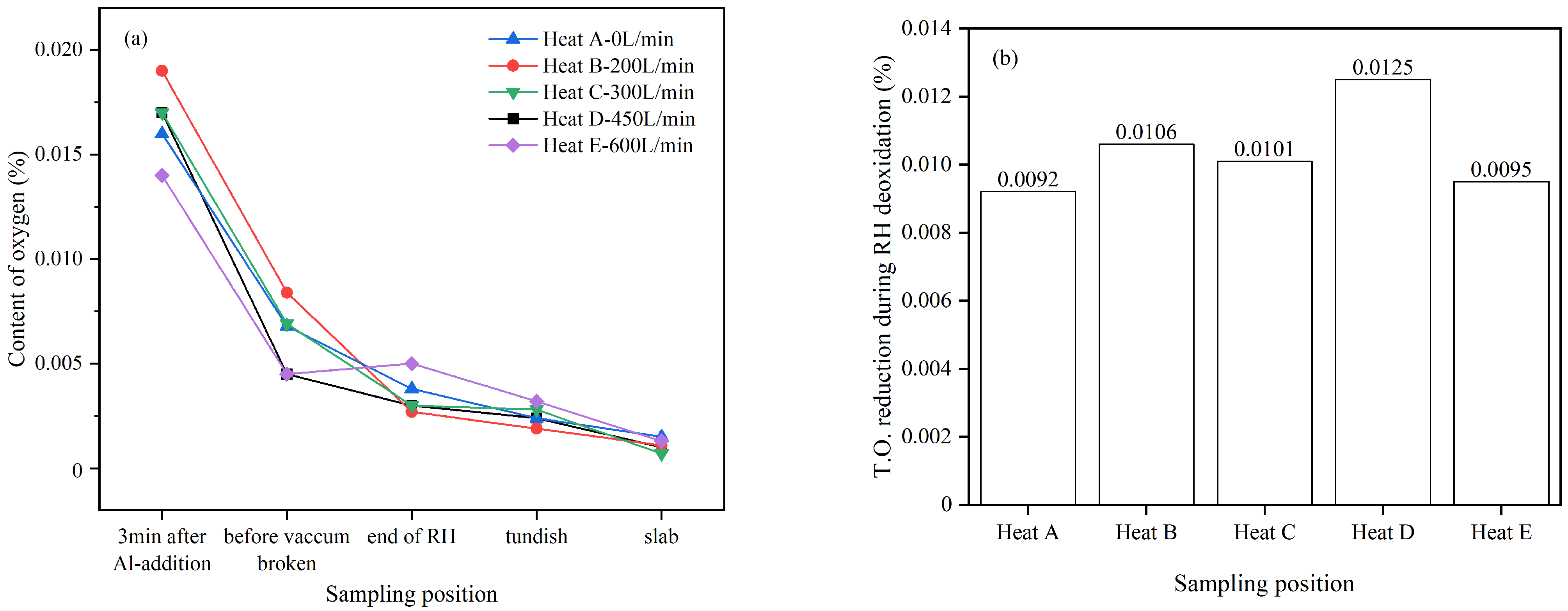 Figure 19b. It is found that the oxygen reduction in the experimental groups (heats B~E) is all higher than that of the control group (heat A). Among them, heat D with an argon injection flow rate of 450 L/min had the highest oxygen reduction, reaching 0.0125%. This suggests that DLAI technology contributes to removing deoxidation products from the molten steel.