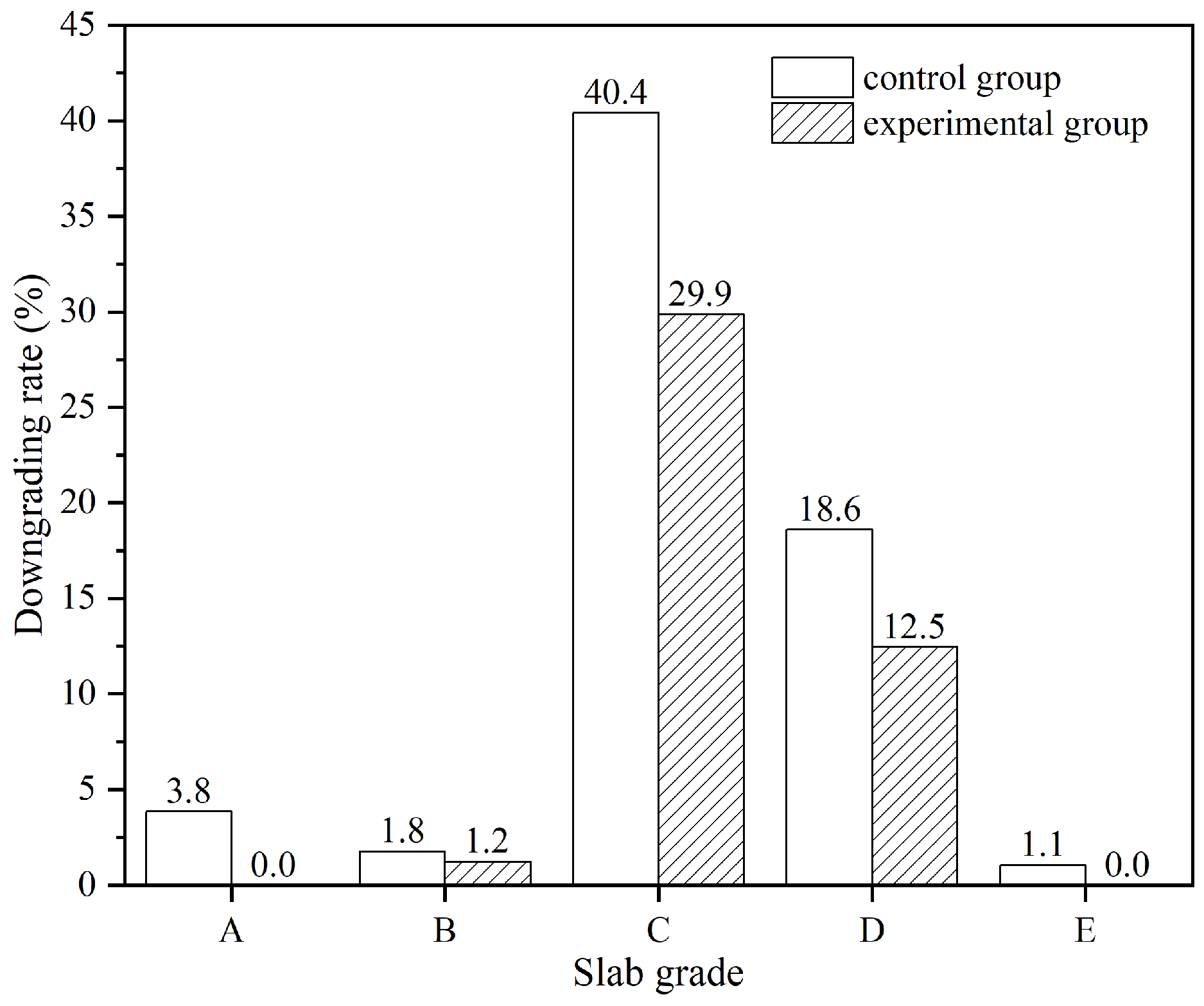 The downgrading rates of slabs in both experimental and control groups are illustrated in