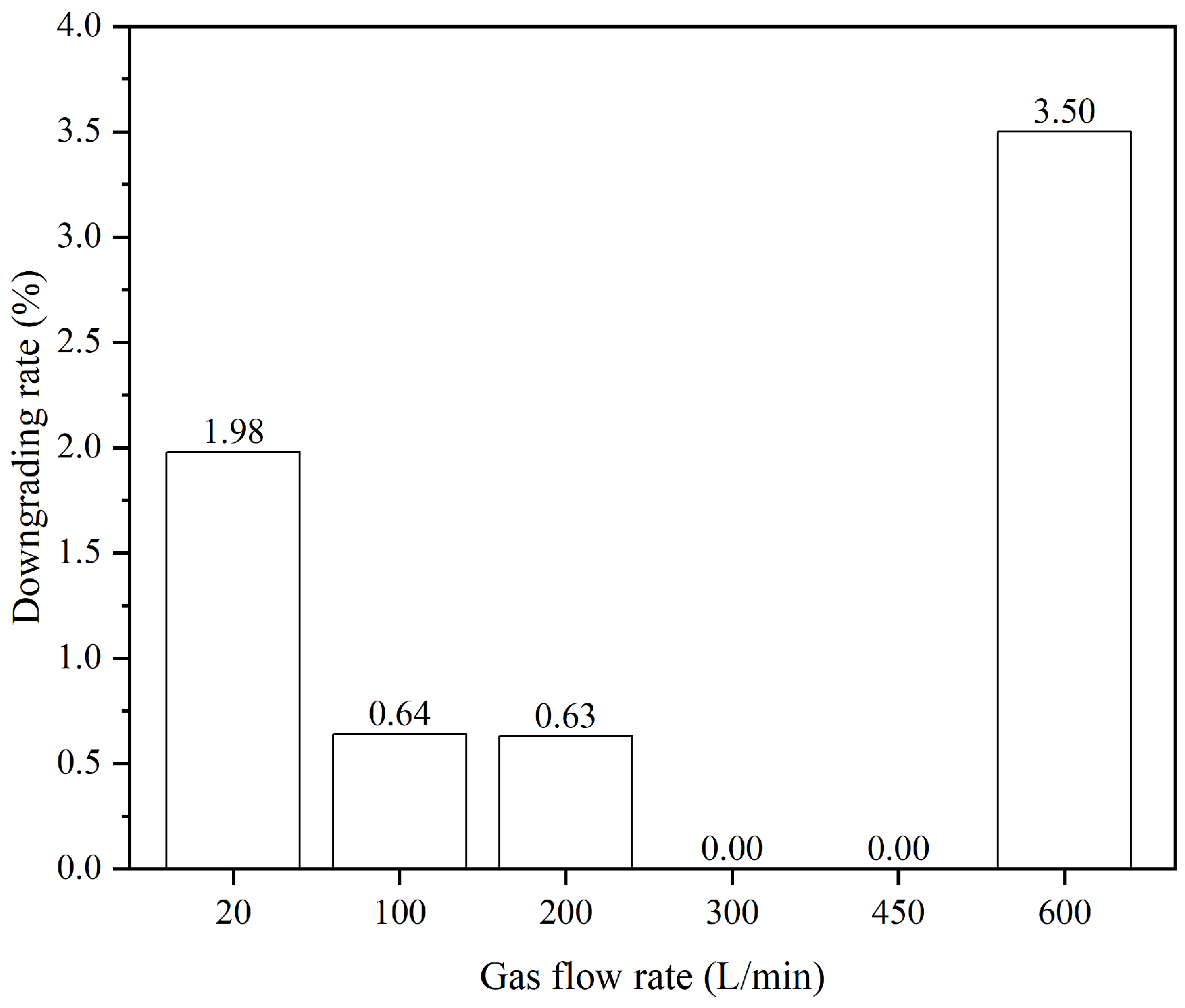 Figure 22. The results show that the inclusion downgrading rate initially decreases and then increases with increasing argon flow rate, reaching its minimum at flow rates of 300 L/min and 450 L/min. This phenomenon can be attributed to the fact that at low argon flow rates, fewer bubbles are generated, resulting in lower adhesion and removal efficiency for inclusions. Conversely, at higher flow rates, larger bubbles are produced, which reduce the adhesion and removal efficiency for small inclusions [