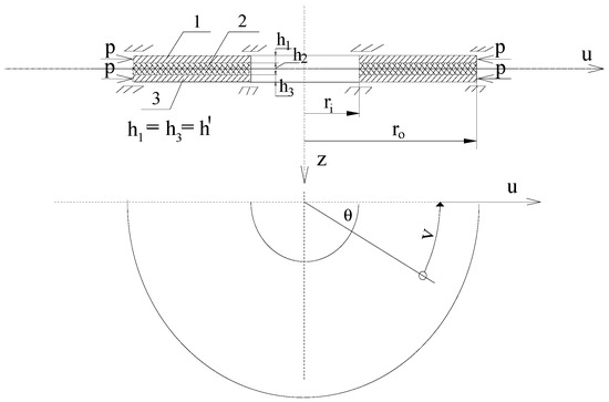 The object of this analysis is a three-layered annular plate, whose outer layers are made of FGM facings. The plate configuration is shown in Figure 1. It consists of three layers: FGM facings and a homogeneous core, forming a classical sandwich cross-section with thinner facings and a thicker core. The analyzed plate is clamped with sliding supports at both the inner and outer edges.