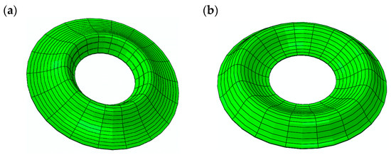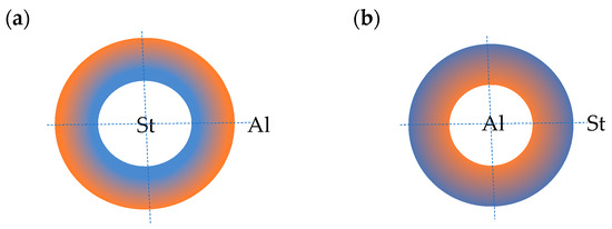 The facings are composed of two metals: steel and aluminum. The material properties vary in the plate’s radial direction according to the functional relation given by Equation (2) for two material models: St-Al, where steel is on the inner edge and aluminum on the outer edge, and Al-St, where aluminum is on the inner edge and steel on the outer edge (see Figure 2).