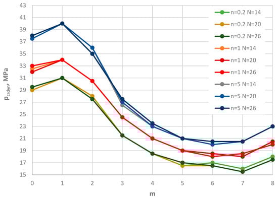 Figure 3 and Table 2 present the results of the critical dynamic loads, pcrdyn, for various modes m for the St-Al plate material model and for three different numbers N of discrete points in the FDM: N = 14, 20, 26. Three values of the power-law exponent n from Equation (2) were considered: n = 0.2, 1, 5. The analyzed plates are loaded on the outer edge. The values of pcrdyn show good compatibility for FDM plate models with the asymmetric form of buckling (m ≠ 0). Larger differences are observed for the axisymmetric buckling form (m = 0). The accuracy between the pcrdyn values for different N does not exceed the technical error of approximately 5%. Therefore, N = 26 was adopted in the FDM numerical calculations.
