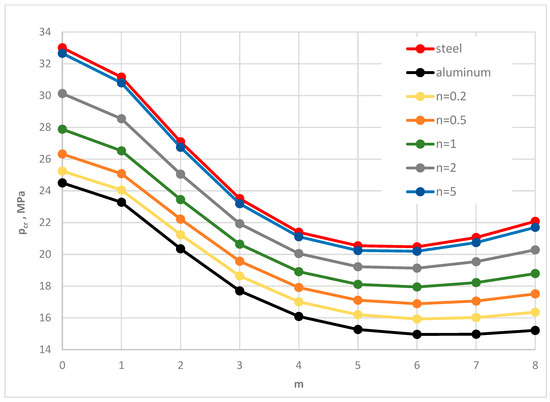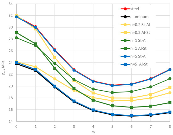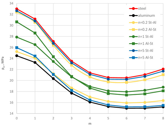 Distribution of the critical static load pcr versus mode number m for St-Al, steel, and aluminum plate models.