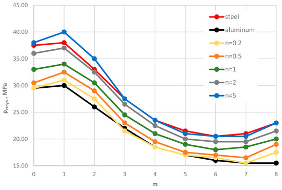 Similar observations for dynamically loaded plates are shown in Figure 5. The critical dynamic loads, pcrdyn, for corresponding modes m are presented for St-Al facing models with different material distributions expressed by the power-law exponent n. For plates with steel facings (St-Al material, n = 5) and plates with aluminum facings (St-Al material, n = 0.2), the critical dynamic load values are particularly close for plates with larger modes m. For these examples, the sensitivity of the dynamic stability appears to be smaller. There are no significant differences between results for plates composed of homogeneous layers and the examined heterogeneous ones, especially for plates with minimal values of pcrdyn.