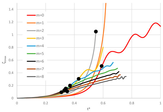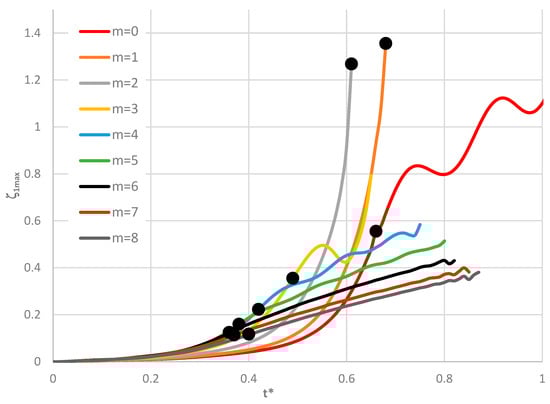 Time history of dimensionless deflections ζ1max depending on St-Al plate mode m for n = 1.
