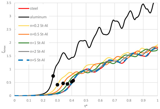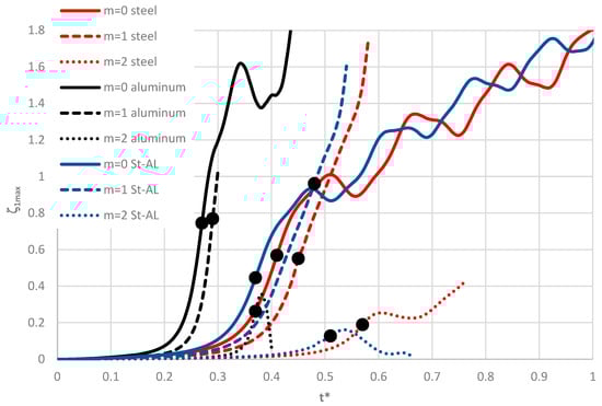 Time history of dimensionless deflections ζ1max depending on steel, aluminum, and St-Al plate models for various power-law exponents n and plate mode m = 0.