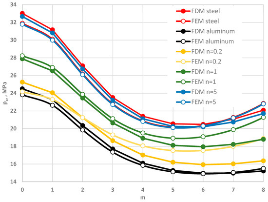 Distribution of the critical static load pcr versus mode number m for homogeneous, St-Al, and Al-St FEM plate models, with power-law exponents n = 0.2, 1, 5.