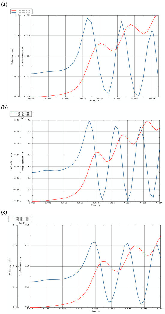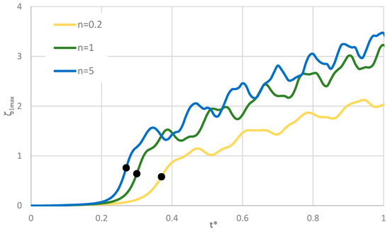 Time histories of plate deflections for various modes are shown in Figure 6, Figure 7 and Figure 8. The curves were obtained for three values of the power-law exponent, n = 0.2, 1, 5. The highlighted dots indicate the moment of the plate’s loss of stability according to the adopted criterion. The results show two groups of curves: one for m < 4, corresponding to fewer than four circumferential waves, and another for m > 3. Differences are observed in the character of the curves, the distribution of points representing the moment of loss of plate stability, and in the overcritical area, where vibrations can be initiated.