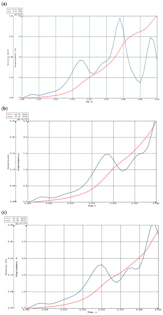Exemplary results for the St-Al plate model loaded on the inner edge are shown in Figure 9 and Figure 10. The time histories of deflections for axisymmetric (m = 0) homogeneous plates and plates with FGM facings, presented in Figure 9, indicate similar dynamic responses for plates with steel–aluminum or steel facings. Increasing the steel content in the facings prolongs the time to the loss of plate stability and increases the dynamic critical load, pcrdyn. The homogeneous plate with aluminum facings has less favorable stability parameters: the critical load is smaller, the critical deflection is higher, and overcritical vibrations with greater amplitude occur compared to the St-Al plate model.
