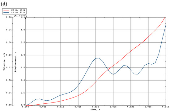 where the vector contains elements expressed by the derivative of the additional deflection with respect to time t, and the number K is given by . Here, K7 represents the rate of mechanical loading growth calculated as the quotient of s (see Equation (1)) to the assumed value of the critical static load pcr, with . The vector contains the additional deflections. The vector contains the plate’s material and geometrical parameters, initial and additional deflections, number m, and dimensionless radius ρ. The matrix contains the plate’s material and geometrical parameters, number m, and parameter b, which represent the interval in the FDM.