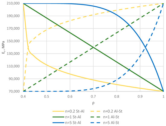 Distribution of Young’s modulus Er of St-Al and Al-St FGM facings versus plate radius ρ.