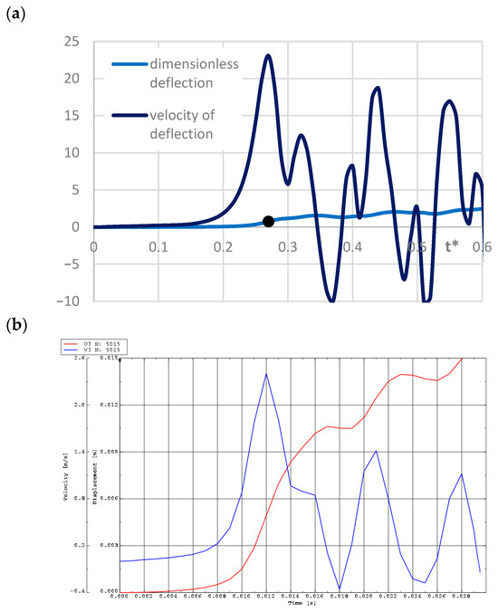 The forms of axisymmetric buckling of plates loaded on the inner and outer edges are shown in Figure 18. Differences in the critical deformations of the plate structure are visible between plates loaded on the inner and outer edges. This axisymmetric form is particularly important for plates loaded on the inner edge. This axisymmetric m = 0 mode corresponds to the plate model with the smallest critical load. The time history of dimensionless deflections presented in Figure 19 for the FDM Al-St plate model loaded dynamically on the inner edge confirms the results obtained for the Al-St plate model loaded statically. The shortest time to loss of plate stability, identifiable by the black dots, and the smallest value of the critical dynamic load pcrdyn occur for the plate model with n = 5. Larger stability parameters are observed for the plate with n = 0.2. Detailed values for the two material plate models, St-Al and Al-St, for both FDM and FEM computational models, are presented in Table 7. Plates are loaded statically and dynamically on the inner edge. For the FGM plate with n = 5, whose critical load values are close to those of a homogeneous steel or aluminum composite plate, the results depend on the material model (St-Al or Al-St). Detailed results show good agreement between the two computational models, FDM and FEM. Critical loads of the St-Al plate model are close to those of a homogeneous steel plate, while values obtained for the Al-St plate model are close to the critical loads for plates with aluminum facings. Considering the detailed values of pcr and pcrdyn calculated for the plate model with n = 5, the St-Al material plate model, for this specific material distribution, is more advantageous from a stability point of view for both inner and outer-edge loads. The values of pcr and pcrdyn are close to those of a composite plate with steel facings. Exemplary time histories of deflections and deflection velocities for the two computational models, FDM and FEM, are presented in Figure 20. The Al-St plate model with n = 5 is loaded on the inner edge. For the FDM plate model, results are presented in dimensionless form (see Figure 20a). For example, dimensionless time t* is related to real time t (Figure 20b) by the formula t* = tK7, where parameter K7 equals 20. The character of the presented curves for both FDM and FEM plate models is comparable. Characteristic overcritical vibrations, initiated by the increasing applied load, are observed.