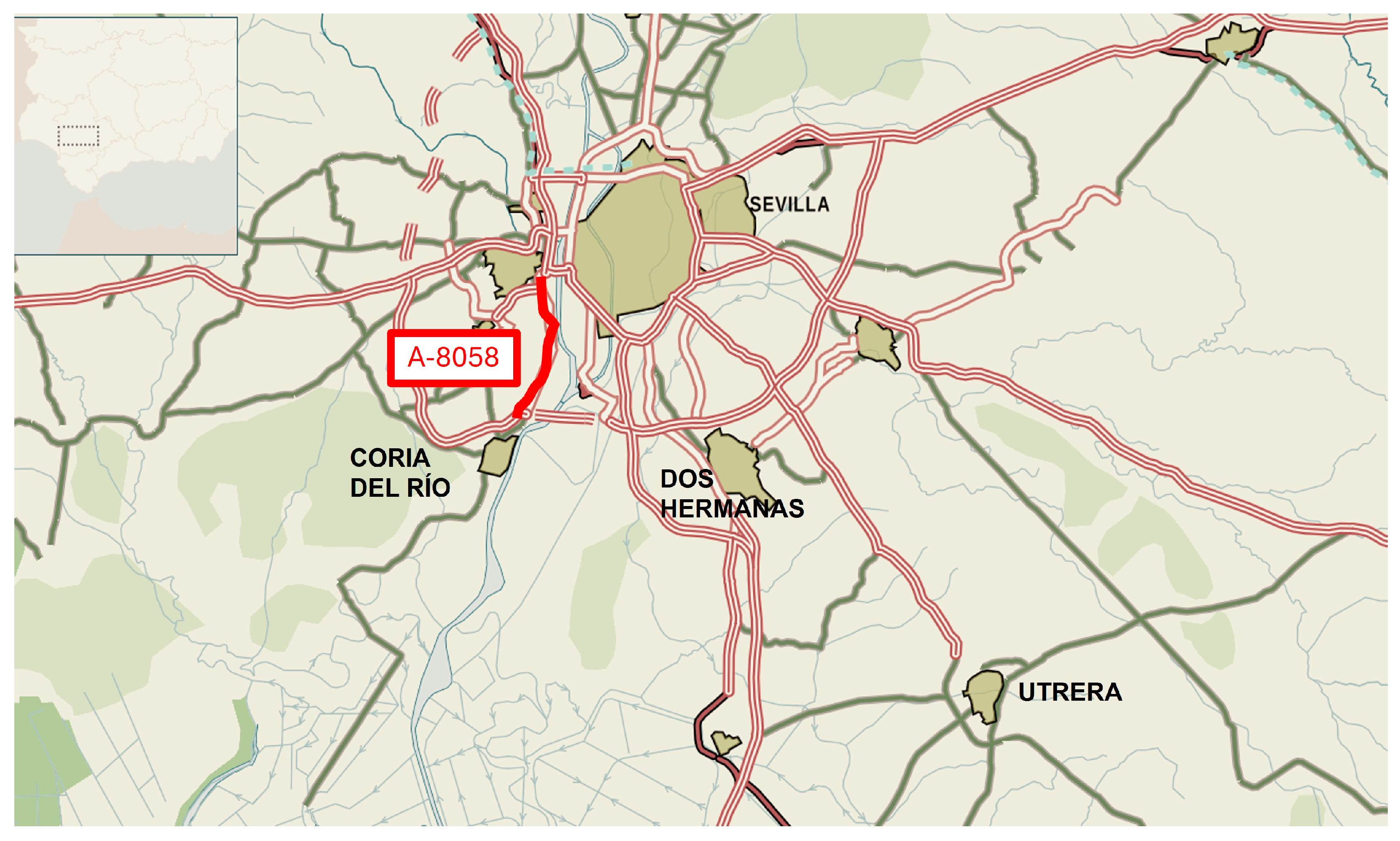 - Scenario 1: A-8058 between Seville and Coria (Figure 5). SMA mixtures were modified with end-of-life tires (ELTs), laid in different proportions.