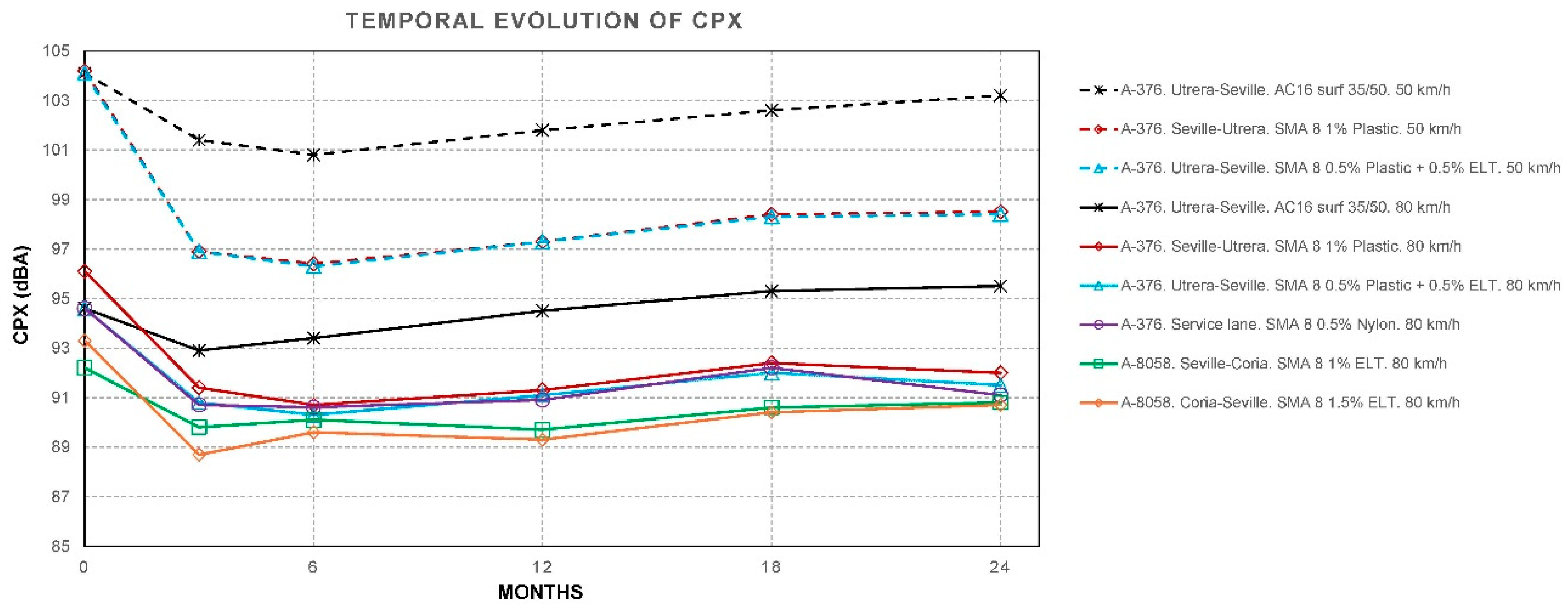- Within two years, the CPX does not worsen. It even improves slightly in hot and dry climates. These trends are consistent with European experience: the initial advantage of low-noise pavements (3–6 dB) is well documented, although the magnitude and persistence depend on the type of mixture and the climate. In the Netherlands and Denmark, porous asphalt starts at –4 to –6 dB and shows annual losses of ~0.2–0.33 dB per year. Less porous materials, such as SMA, tend to stabilize their response provided there is no severe clogging [75,76].