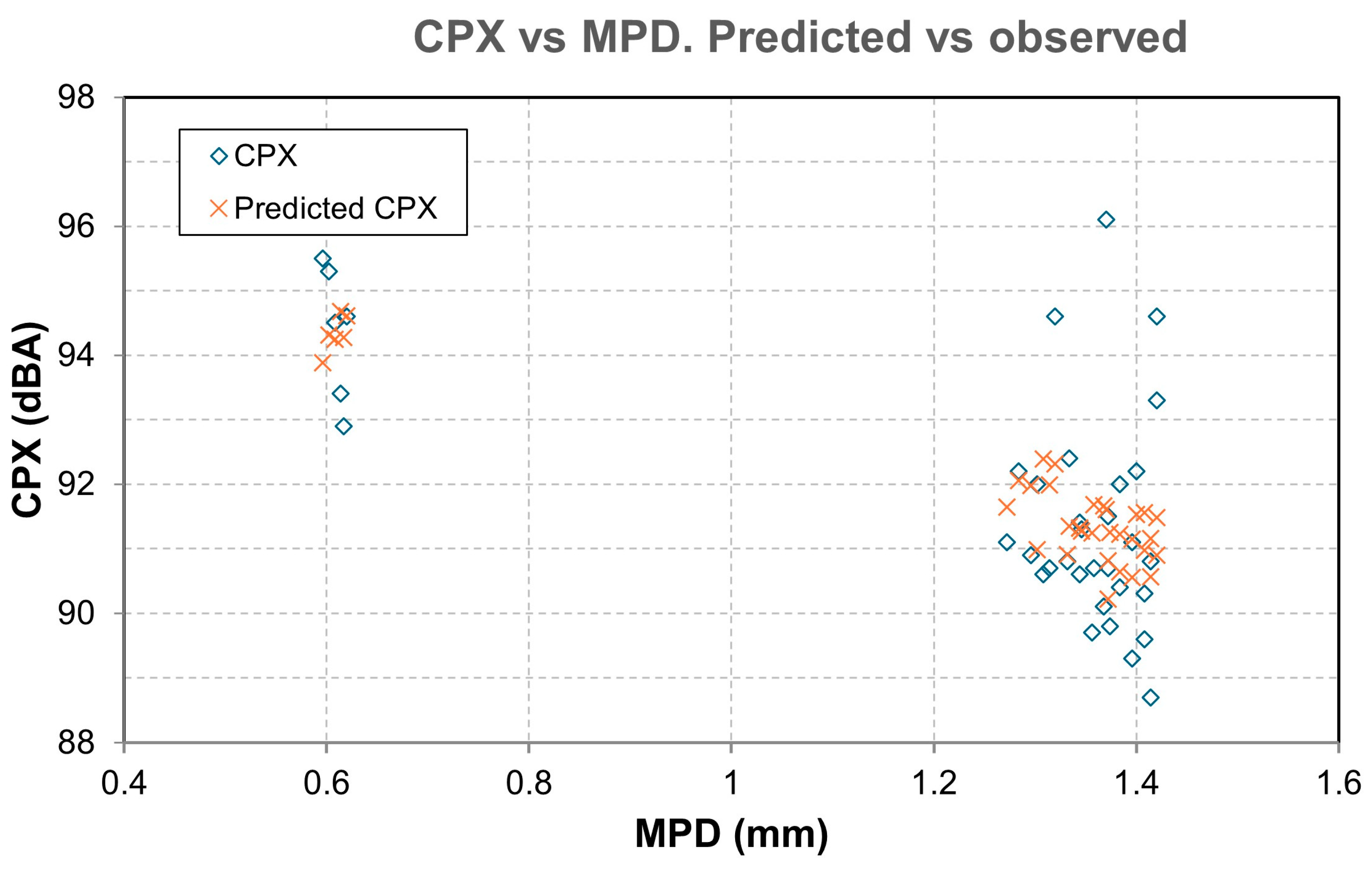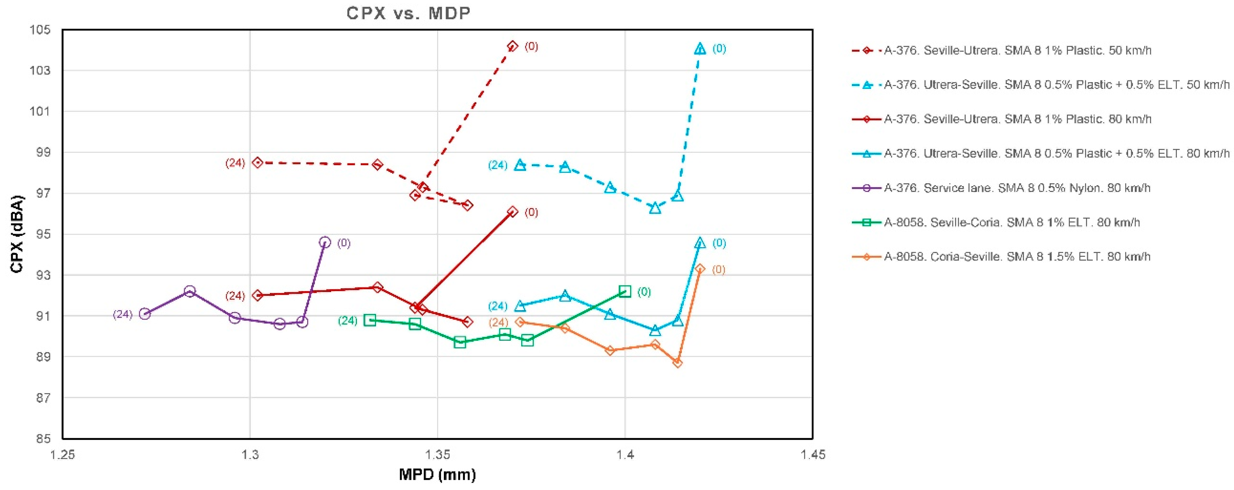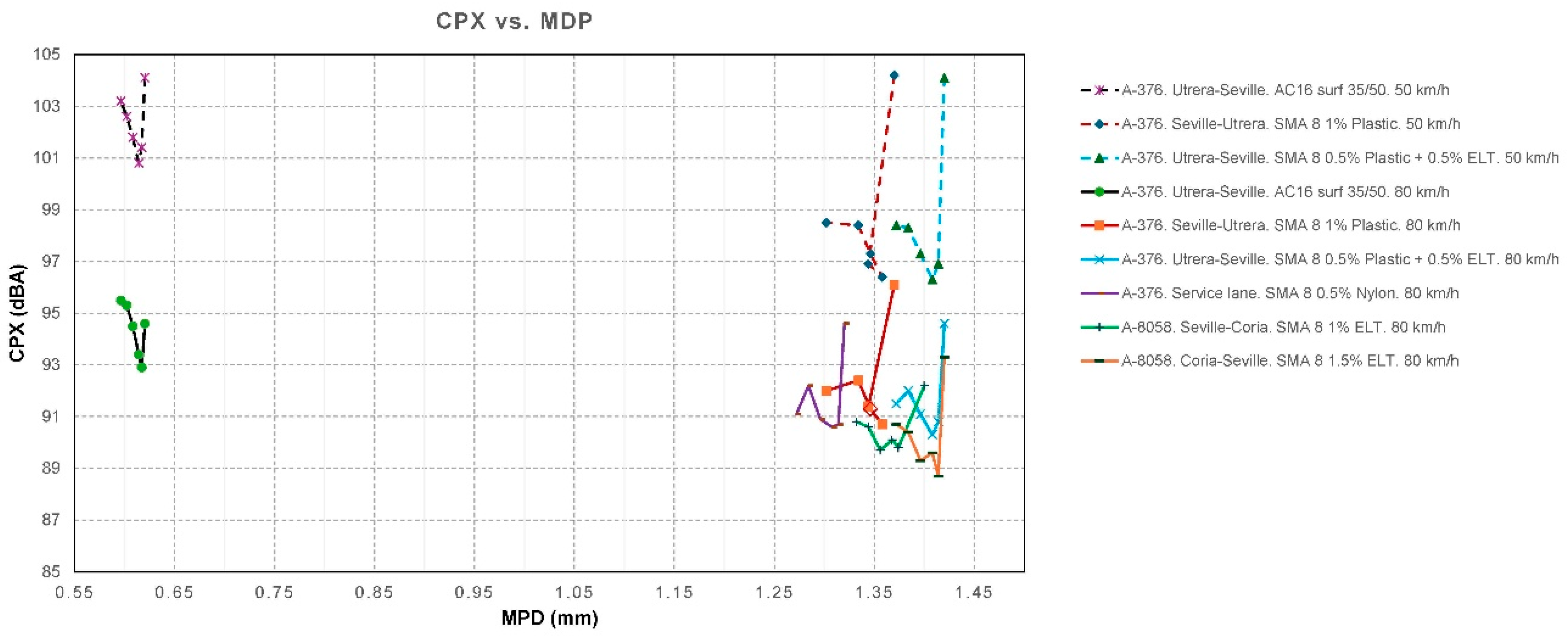 - The factor for MDP is β1 = −2.437 dB/mm. This means that, provided all other factors remain constant, a higher MPD indicates a lower CPX. In a typical range, macrotexture values are between 0.6 and 1.4 mm. Moving from the lower to the upper end of this range implies a difference of 0.8 mm, which, according to the model, represents a decrease of 0.8·(−2.437) =−1.95 dB. This is consistent with the physical hypothesis: an “optimal” macrotexture reduces air pumping and tire block excitation in the range where TPIN dominates.