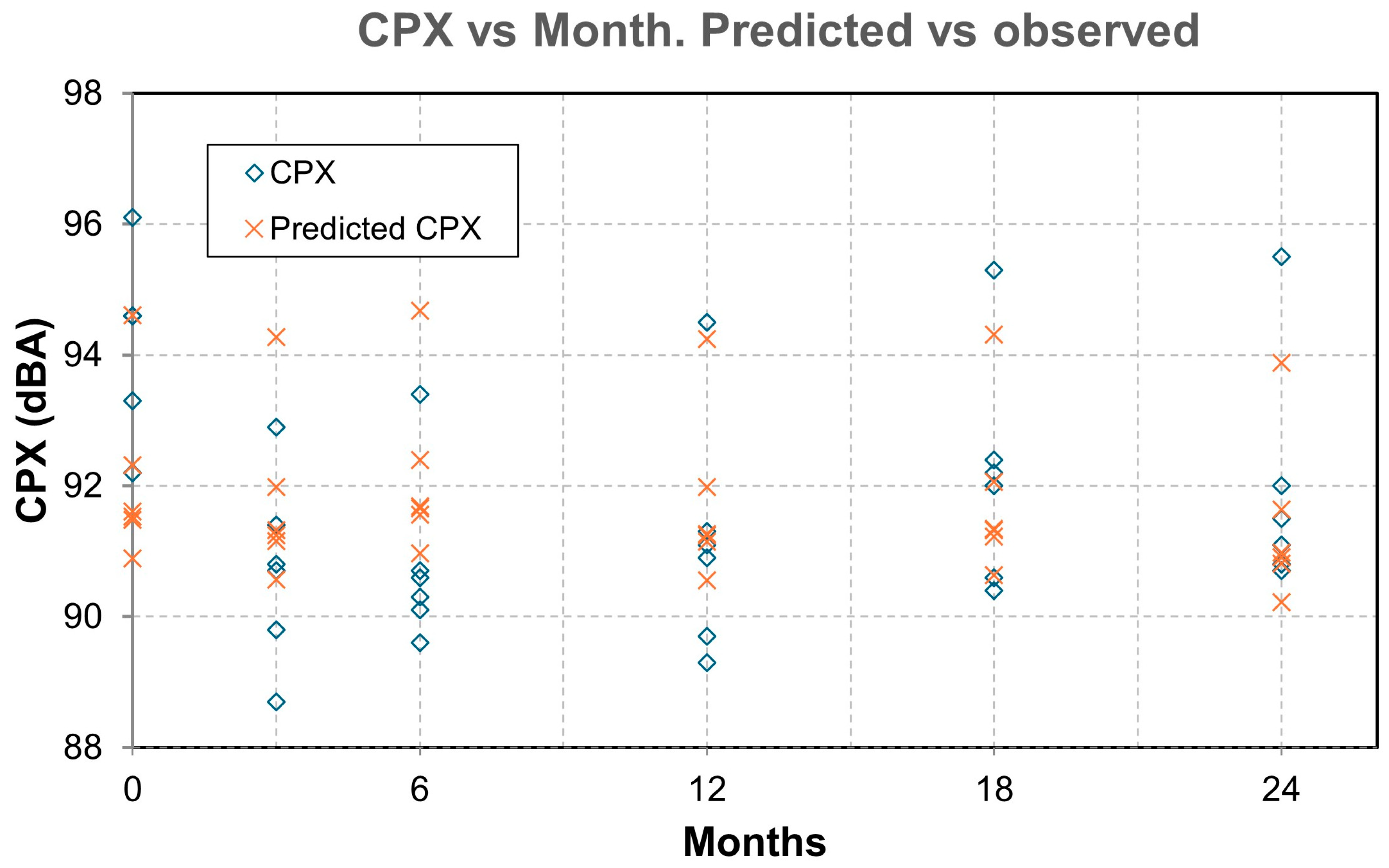 - CPX response variable (dB (A)): level measured per campaign and lane. It is denoted as CPXij, where i is the campaign (0, 3, 6, 12, 18, or 24 months) and j is the section/lane.