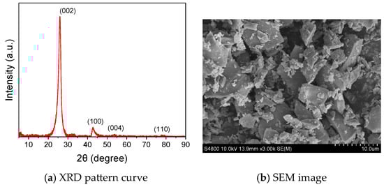 The P.I. 42.5 Portland cement powders and the commercial flash graphene powders (FGP) were used to prepare cement paste samples. The chemical composition of the cement powders, listed in Table 1, was measured by an X-ray fluorescence spectrometer (Axios, Malvern Panalytical Ltd., Malvern, UK). The flash graphene powders were produced from carbon black powders by the flash Joule heating process, provided by Taiyuan Saiyin New Materials Co., Ltd. (Taiyuan, China). The XRD pattern curve and an SEM image of the FGP are shown in Figure 1. An asymmetric (002) peak, as shown in Figure 1a, appeared along with a weak (100) peak, which is typically displayed in turbostratic graphene [34]. The particle sizes of the FGP ranged from 2 to 10 µm, as shown in Figure 1b. The electrical conductivity value of FGP was approximately 3.4 S/mm, measured by a four-probe resistance tester (FT-300, Ningbo Ruike Micro Intelligence Technology Co., Ltd., Ningbo, China) under a test pressure of 10 MPa. The BET specific surface area value of the FGP was 167 m2/g, measured by a specific surface area and porosity analyser (TriStar II Plus, Micromeritics Instrument Corporation, Norcross, GA, USA).