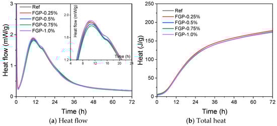 Figure 5 shows the heat flow and total heat curves of cement paste slurries containing different dosages of FGP during the first 72 h of hydration. In Figure 5a, the peak values of the second hydration heat evolution peaks initially decreased and then increased with the dosage of FGP in the slurry, indicating that the formation and precipitation of calcium hydroxide crystals during the acceleration period of Portland cement were significantly influenced. However, during the deceleration periods, the hydration of C3S was also influenced by the presence of FGP with different dosages; all of the values of the third peak in the heat flow curves increased with the FGP dosages.