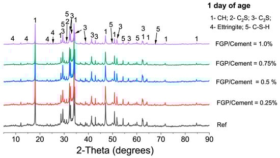 X-ray diffractograms of paste containing different dosages of FGP at 1 day of age.