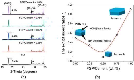 Figure 8a shows the XRD pattern of paste samples containing different contents of FGP at 28 days of age. The typical peaks of Portlandite at {0001}, {10–10}, and {10–11} planes appear on the patterns of all samples, indicating that the presence of FGP does not affect the lattice parameters of Portlandite crystals. However, the intensities of facets of {0001} and {10–10} change slightly with the dosages of FGP in the paste samples. In Figure 8b, the aspect ratios (rL) of Portlandite crystals first decrease and then increase with the dosages of FGP in the paste samples, which corresponds with the crystalline shape change in Portlandite [41].