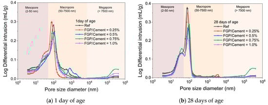 The pore size distribution curves of paste with different dosages of FGP at 1 day and 28 days of age.