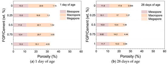 Figure 11 shows the pore size distribution curves of samples containing different dosages of FGP measured by a mercury porosimeter at 1 day and 28 days. Figure 12 shows the measured porosity values for different pore sizes in each sample group. In Figure 11, it is easy to see that there are three peaks in each curve of the samples at 1 day of age. The first peak is in the range of 2 to 50 nm (mesopore), the second and the third peaks are in the range of 50 to 7500 nm (macropore), and the third peak is in the range of above 7500 nm (megapore). At 28 days, there are only three peaks in each curve; the first peak is in the range of 2 to 50 nm, the second peak is in the range of 50 to 100 nm, and the third peak is in the range of above 7500 nm. The values of the first and second peaks in pore size distribution curves at 28 days of age decrease obviously in the samples containing FGP. In Figure 12a, at 1 day of age, the porosity of mesopores first decreases and then increases slightly with the increase in the FGP-to-cement mass ratios, which may be because of the morphological variation of hydrates (AFt phases), as mentioned in Section 3.1.2. At 28 days, the sum of porosity of mesopores and macropores shows a similar changing law, which also first decreases and then increases slightly with the increase in the FGP-to-cement mass ratios. According to the classical Power’s porosity–strength theory [42], the strength increases with the decrease in capillary voids (smaller than 50 nm). Therefore, the strength values of the hardened paste samples initially increase and then decrease with the increase in the FGP-to-cement mass ratios. The following section will discuss the test data for the compressive and flexural strength values of samples at various ages.