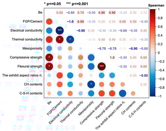Figure 18 shows the Spearman rank correlation matrix for the Be, FGP-to-cement mass ratios, conductivities, porosity, and strength values of the hardened cement paste samples at 28 days of age. The Spearman correlation matrix represents a non-parametric statistical measure that evaluates the strength and direction of a monotonic relationship between two variables, such as those represented by the horizontal and vertical axes. The correlation coefficient ranges from −1 to +1. A positive coefficient value means a positive association, while a negative value means a negative association, and a value of 0 implies no association between the two variables. The absolute values of Spearman rank coefficients between 0.4 and 0.6 are moderate, while those between 0 and 0.3 are weak [26,27] and are generally considered too weak to be considered a significant result. The asterisks in the lower triangular grids in Figure 18 are the p-values in the statistical analysis, representing the significance level of parameters on the horizontal axis to those on the vertical axis. One asterisk, two asterisks, and three asterisks indicate that the p-values are smaller than 0.05, smaller than 0.01, and smaller than 0.001, respectively. For example, the significance levels of the change in electrical conductivity and the FGP/cement ratios are much higher than those of the compressive and flexural strength values of the samples.