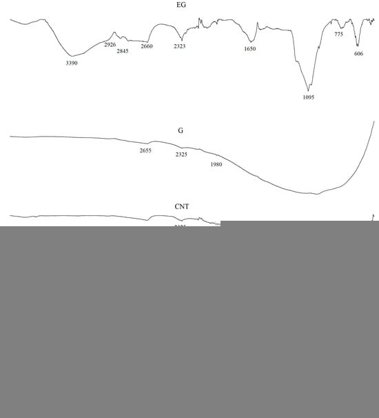 The spectrum of the EG filler is characterized by a broad band in the 3420–3380 cm−1 range, corresponding to O–H stretching vibrations. The bands at 2926 and 2845 cm−1 indicate the presence of methylene (C–H) groups, which are typical for the 2850–2960 cm−1 region. The bands observed between 1340 and 1700 cm−1 can be assigned to C=C bonds, whereas the broad band at 1640 cm−1 is associated with the presence of carboxyl groups and with C–H stretching vibrations. A characteristic peak at around 1095 cm−1 indicates the presence of C–O bonds in the chemical structure of the filler [39,40,41].
