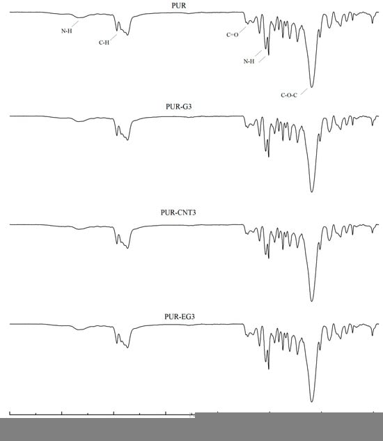 FTIR analysis of the PUR composites PUR, PUR-CNT3, PUR-G3 and PUR-EG3.