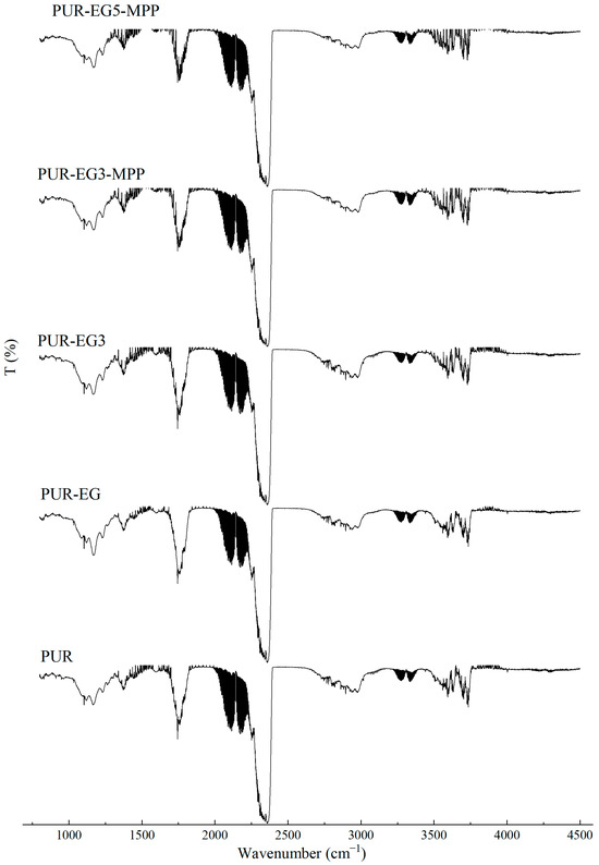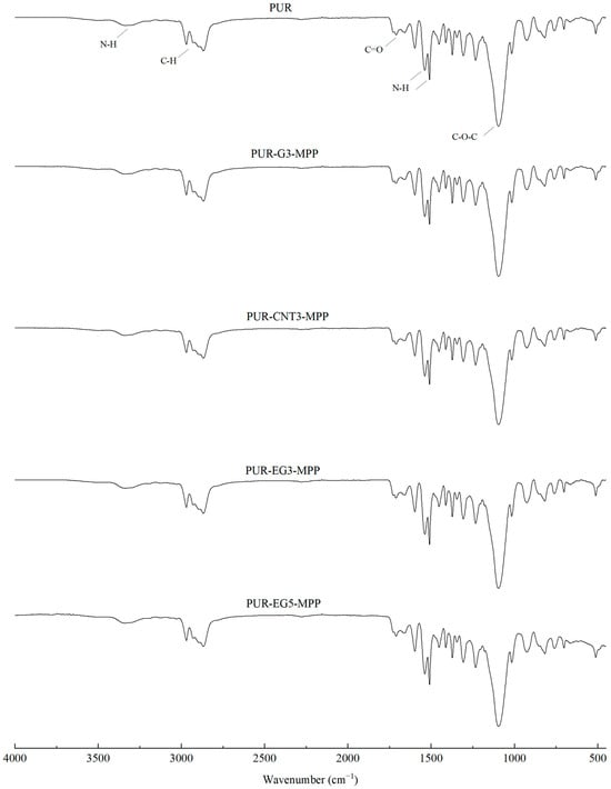 FTIR analysis of the PUR composites PUR-CNT3-MPP, PUR-G3-MPP, PUR-EG3-MPP and PUR-EG5-MPP.