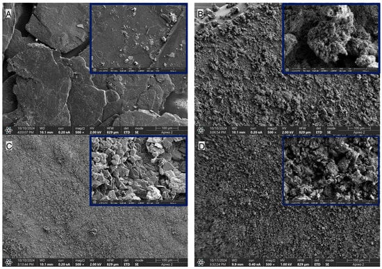 Comparison of the morphology of the PUR composite fillers: (A)—EG, (B)—CNTs, (C)—G and (D)—MPP. Imaging performed using SEM. The upper-right inset shows a 5 µm magnification.