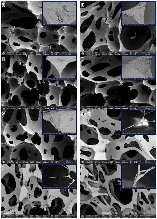 SEM imaging of the PUR composites: (A)—PUR, (B)—PUR-EG1, (C)—PUR-EG3, (D)—PUR-EG3-MPP, (E)—PUR-G1, (F)—PUR-G3, (G)—PUR-G3-MPP, (H)—PUR-CNT1, (I)—PUR-CNT3, (J)—PUR-CNT3-MPP. The upper-right inset shows a 10 µm magnification.