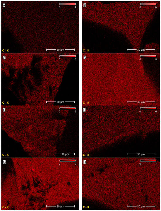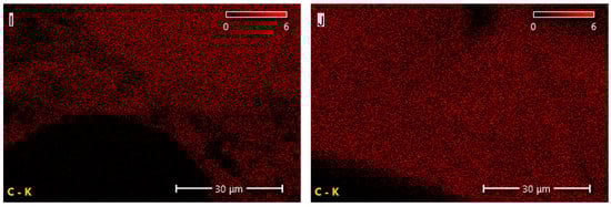 Elemental (carbon) distribution maps of the PUR composites: (A)—PUR, (B)—PUR-EG1, (C)—PUR-EG3, (D)—PUR-EG3-MPP, (E)—PUR-G1, (F)—PUR-G3, (G)—PUR-G3-MPP, (H)—PUR-CNT1, (I)—PUR-CNT3 and (J)—PUR-CNT3-MPP. Imaging obtained using the SEM-EDS technique.