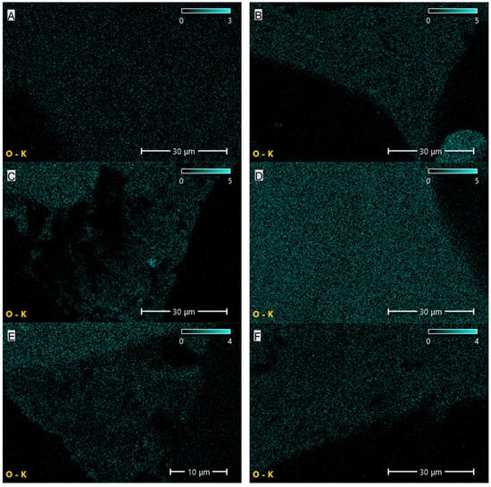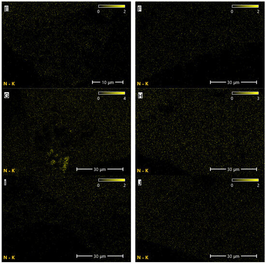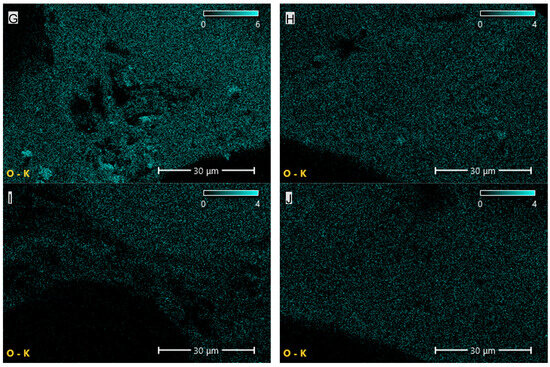 Elemental (oxygen) distribution maps of the PUR composites: (A)—PUR, (B)—PUR-EG1, (C)—PUR-EG3, (D)—PUR-EG3-MPP, (E)—PUR-G1, (F)—PUR-G3, (G)—PUR-G3-MPP, (H)—PUR-CNT1, (I)—PUR-CNT3 and (J)—PUR-CNT3-MPP. Imaging obtained using the SEM-EDS technique.