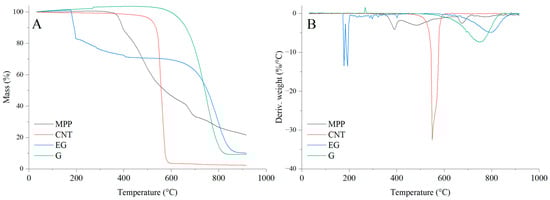 The SEM images presented in Figure 5 show clear morphological differences between the analyzed fillers. The CNTs, G and MPP fillers exhibit pronounced granularity and irregular particle shapes, whereas the EG filler displays the smallest particle size and the presence of large, smooth plate-like structures with a more homogeneous morphology.