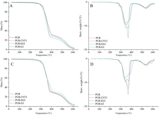 Thermal analysis of the fillers and PUR composites was carried out using an STA 449 F3 Jupiter thermogravimetric analyser (TGA) (Netzsch, Selb, Germany). The measurements were performed within the temperature ranges of 25–650 °C for PUR composites and 25–900 °C for fillers, using samples of 5 ± 1 mg placed in open Al2O3 crucibles. Analyses were conducted under an O2/N2 atmosphere (20/40 µL/min) at a constant heating rate of 10 °C/min. Thermograms were processed using Proteus Thermal Analysis 8.0.3 software (Netzsch, Selb, Germany). Based on the obtained TG and DTG curves, the following thermal parameters were determined: the temperature of 5% mass loss (T5), the temperature of 50% mass loss (T50), the temperature of maximum decomposition rate (TRMAX), the decomposition rate (dm/dt), the temperature range of char oxidation (ΔTs), the residue after thermal decomposition (PTD) and the residue at 600 °C (P600) and 900 °C (P900).