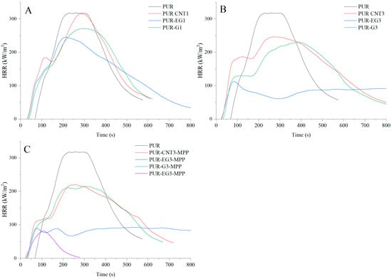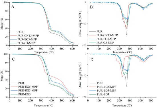 The results showed that all applied carbon fillers markedly reduce the dm/dt parameter. This reduction, proportional to the filler content in the polymer matrix, indicates that a smaller amount of volatile, combustible degradation products escapes from the sample into the flame zone. The most pronounced decrease in dm/dt was recorded for PUR-G3 and PUR-EG3-MPP.