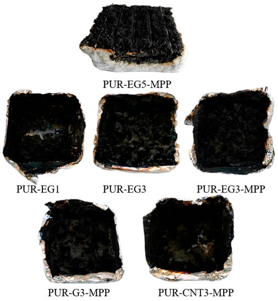 Virtually all tested fillers increased the amount of solid residue formed after thermal decomposition (PTD). The increase in PTD in the combined carbon-filler/MPP systems follows directly from their mechanism of action: melamine polyphosphate undergoes intense foaming during thermal decomposition, forming a solid protective phase, while carbon fillers act as carbon donors. Additionally, phosphoric acid released from MPP promotes char-forming crosslinking reactions. The combined use of MPP with graphene, expanded graphite or CNTs significantly reduced the flammability of the PUR foams, with the expanded-graphite/MPP system being the most effective among the tested fire-retardant formulations.